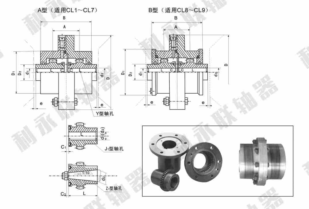 CL型齒式聯軸器適用于聯接兩水平軸線傳動軸系,具有 補償兩軸相對偏移的性能,傳遞公稱扭矩為710-1000000N.m。CL型齒式聯軸器屬于可移式剛性聯軸器,由兩個有內齒的外殼和兩個外齒的套筒所組成,套筒和軸用鍵聯接,兩個外殼用螺栓聯成一體,外殼和套筒之間設有密封圈。內齒輪齒數和外齒輪齒數相等,通常采用壓力角為20°的漸開線齒廓。工作時靠嚙合的輪齒傳遞扭矩。由于輪齒之間留有較大的 ,所以能補償兩軸的不同心和偏斜,為了減少輪齒的磨損和相對位移的摩擦阻力,在內部注入潤滑油。齒式聯軸器的角位移允許在30′。齒式聯軸器具有徑向、軸向和角向等軸線偏差補償能力,具有結構緊湊、回轉半徑小、傳遞扭矩大、傳動效率高、噪聲低及維修周期長等優點,特別適用于低速重載工況,如冶金、礦山、起重運輸等行 業、也適用于石油、化工、通用機械等各類重型機械的軸系傳動。