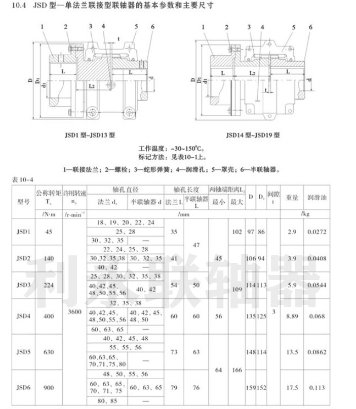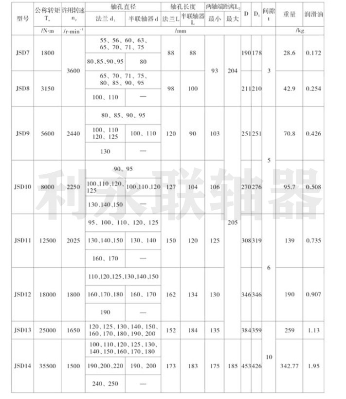 JSD型單法蘭聯接型聯軸器由外套、球面滾子、半聯軸器、內蓋、外蓋等件組成.半聯軸器通過沿圓周分布的球面滾子與外套相聯接,球面滾子在半聯軸器和外套之間的孔內,以傳遞轉矩并承受徑向力,兼起調心軸承的作用,可補償減速機的輸出軸與卷筒軸線之間的角位移,其機構與彈性柱銷齒式聯軸器相類似.使用時,半聯軸器套裝于減速機輸出軸上,外套與鋼絲繩卷筒用高強度螺栓聯接,轉矩和徑向載荷通過球面滾子在半聯軸器和外套之間傳遞.球面滾子聯軸器具有補償兩軸相對位移的性能,結構緊湊,質量輕,可靠性高,安裝方便,用于起重機小車上機構容易布置.聯軸器所聯兩軸由于制造誤差、裝配誤差、安裝誤差、軸受載而產生和變形、基座變形、軸承磨損、溫度變化、部件之間的相對運動等多種因素而產生相對位移。一般情況下,兩軸相對位移是難以避免的,但不同工況條件下的軸系傳動所產生態平衡位移方向,即軸向、徑向角向以及位移量的大小有所不同。只有撓性聯軸器才具有補償兩軸相對位移的性能,因此在實際應用中大量選擇撓性聯軸器。剛性聯軸器不具備補償性應用范圍受到 ,因此用量很少。角向位移較大的軸系傳動宜選用萬向聯軸器;有軸向竄動,并需控制軸向位移的軸系傳動,應選用膜片聯軸器;只有對中精度很高的情況下才選用剛性聯軸器。小轉矩和以傳遞運動為主的軸系傳動,要求聯軸器具有較高的傳動精度,宜選用金屬彈性元件的撓性聯軸器。大轉矩和傳遞動力的軸系傳動,對傳動精度亦有要求,高轉速時,應避免選用非金屬彈性元件彈性聯軸器和可動元件之間有 的撓性聯軸器,宜選用傳動精度高的膜片聯軸器。